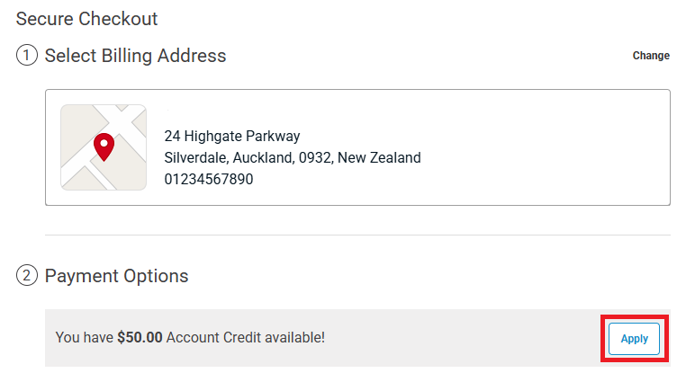 If your checkout defaults to a specific payment method, you will need to select the back arrow on your payment method and then select "apply" on your account credit before continuing, as shown below: