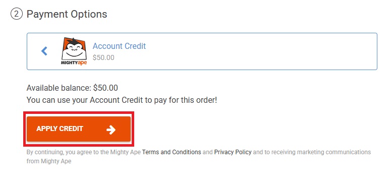 If your checkout defaults to a specific payment method, you will need to select the back arrow on your payment method and then select "apply" on your account credit before continuing, as shown below: